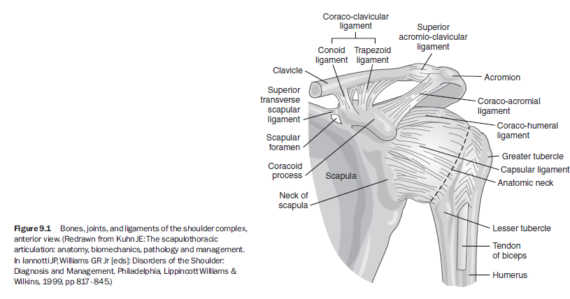 어깨 복합체를 구성하는 뼈는 견갑골, 상완골, 쇄골, 흉골 등이 있다(그림 9.2 참조). 견갑골은 어깨 복합체의 기저 구조물로, 다수 근육 및 인대, 그리고 관절순(glenoid labrum)의 부착점이 된다. 상완골두(humeral head)는 상지 및 손을 견갑골에 연결하는데, 상완골두가 견갑골의 관절와(glenoid fossa)와 만나 견관절(glenohumeral joint)을 이룬다. 상완골두의 관절면은 관절와의 약 2~3배로, 실제로 상완골두의 일부만이 관절와와 접촉한다. 이는 견관절이 본질적으로 불안정한 원인이며, 견관절은 신체 주요 관절 중 탈구가 가장 흔하다. 다행히도 섬유연골성 구조물인 관절순은 관절와의 깊이를 증가시키고 일종의 ‘쐐기 역할(chock block)’을 하여 상완골두의 전위(translation)를 감소시킴으로써 탈구 위험을 줄여준다.